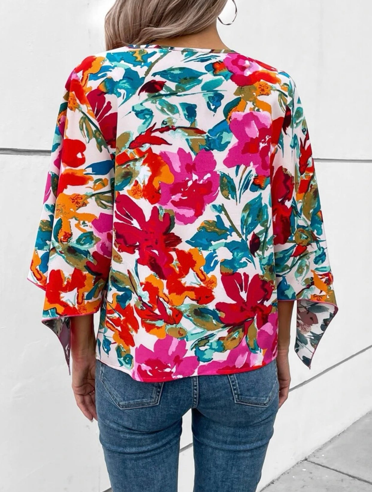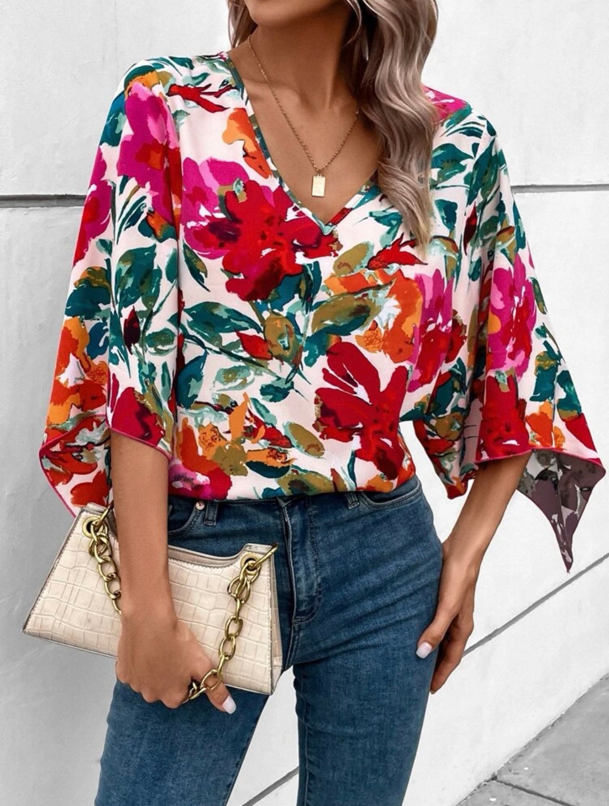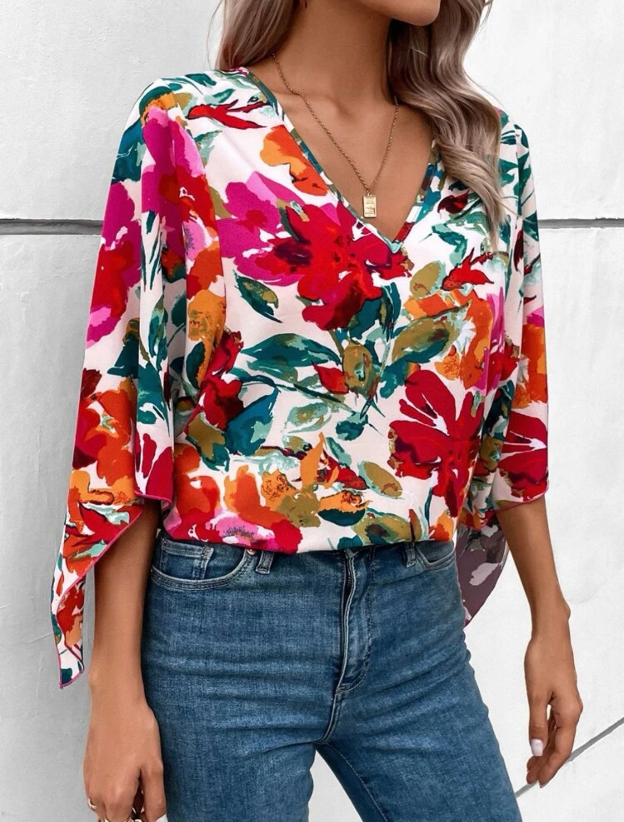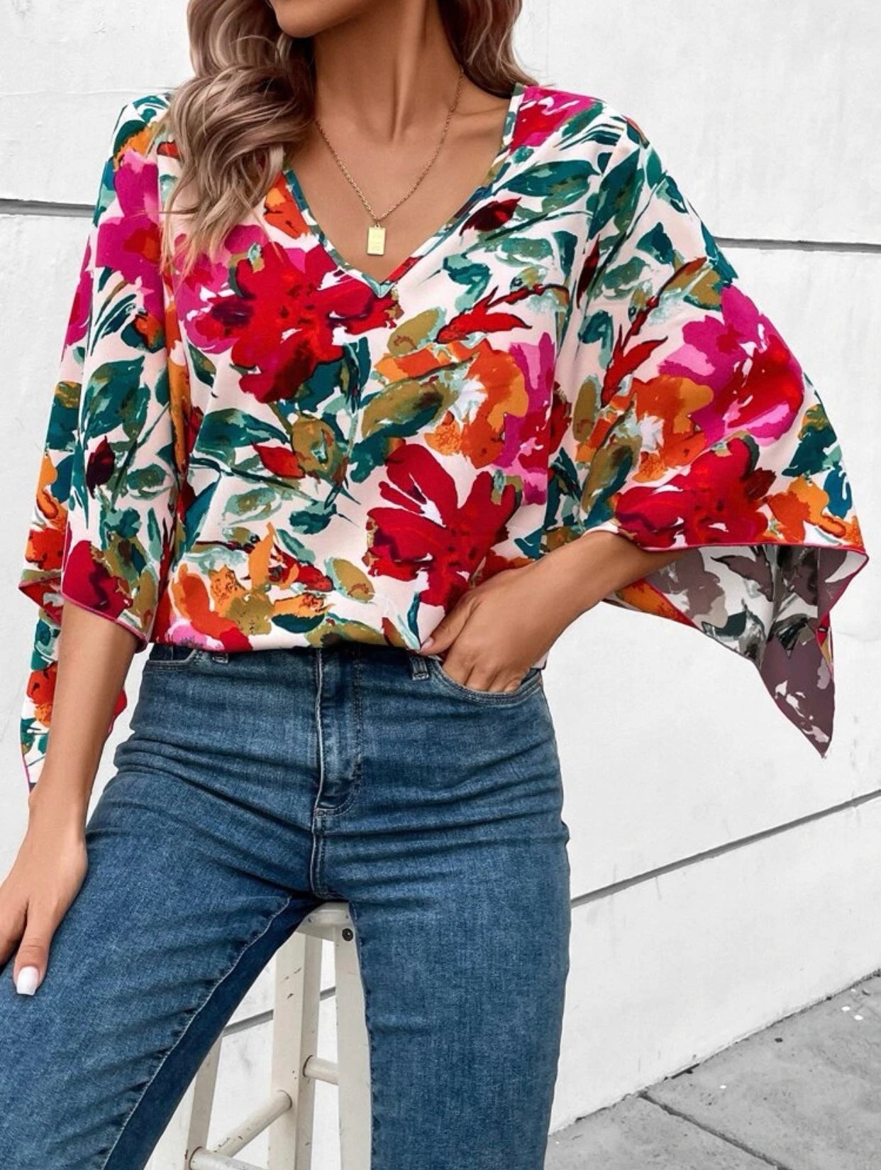 Elevate your style with our Floral Print Batwing Sleeve Blouse – a perfect balance of elegance and comfort. Delicate florals adorn the fabric, creating a charming and feminine look. The loose batwing sleeves offer chic movement and comfort. Crafted from breathable fabric, it transitions seamlessly from day to night. Pair with pants for the office or jeans for a stylish evening. Embrace nature's beauty in this versatile statement piece.