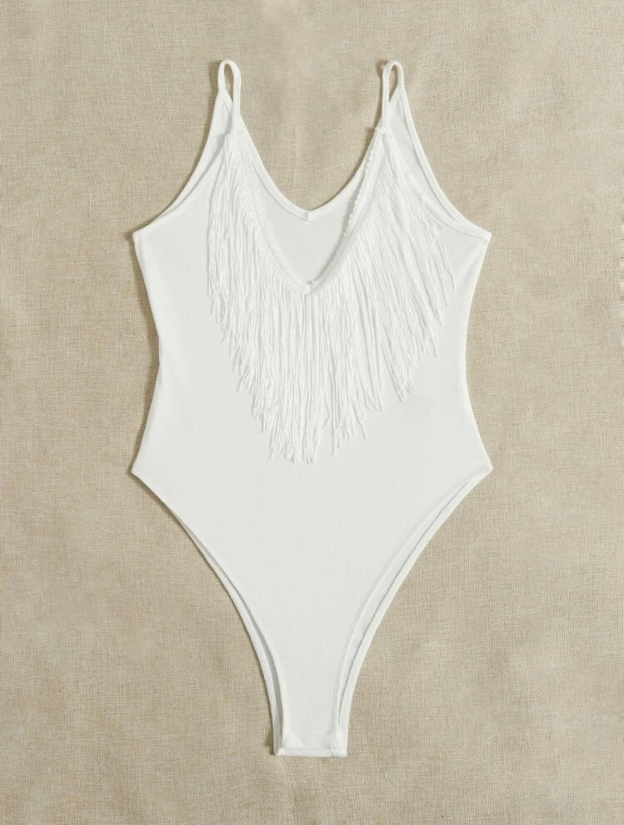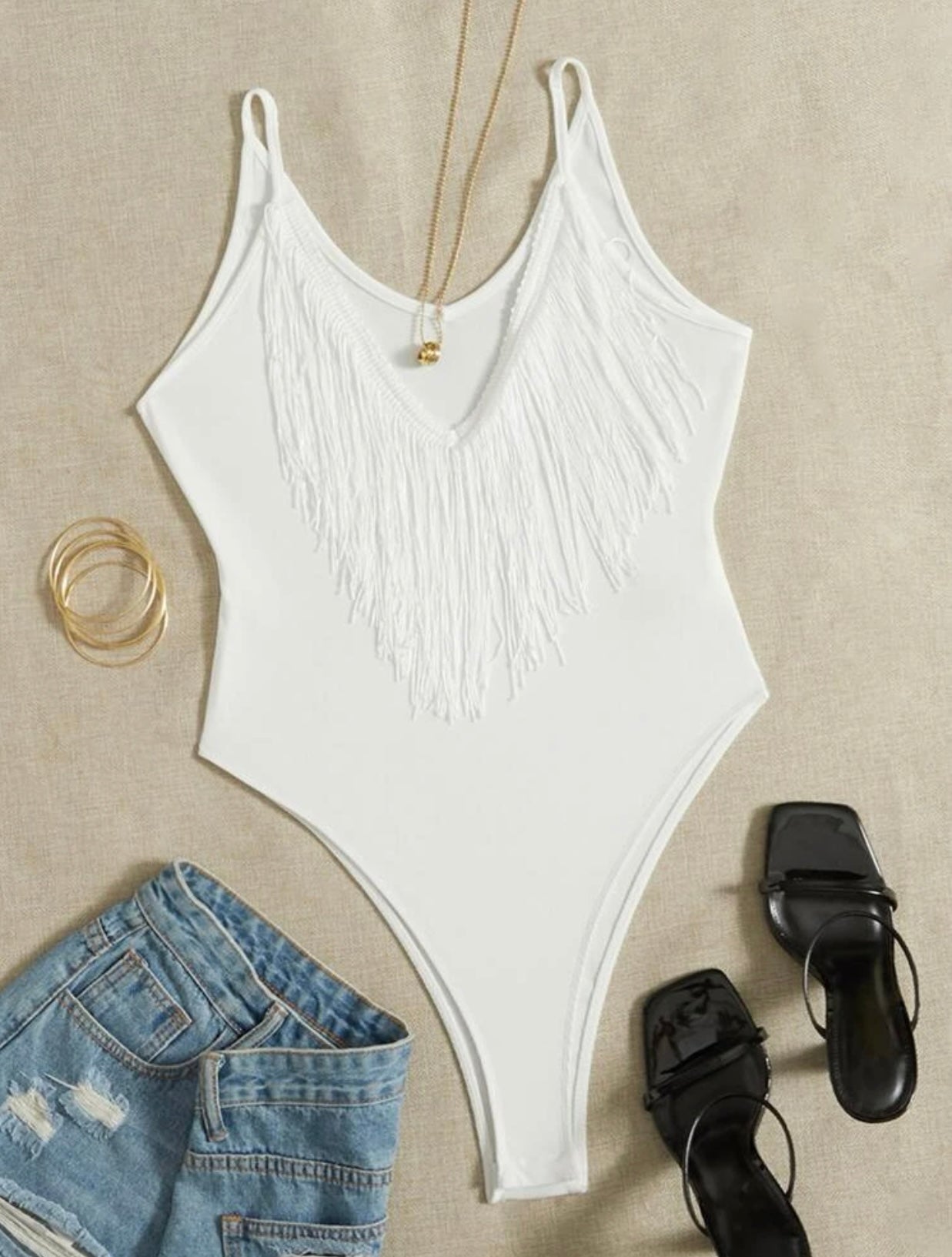 Introducing our chic Fringe Trim Cami Bodysuit, a playful and alluring addition to your wardrobe. This sleek cami design features a V-neckline, adjustable spaghetti straps, and eye-catching fringe trim along the hemline. Crafted for a figure-hugging fit, it's perfect for a night out or a festival adventure. Embrace the joy of effortless style and dance the night away in this attention-grabbing bodysuit.