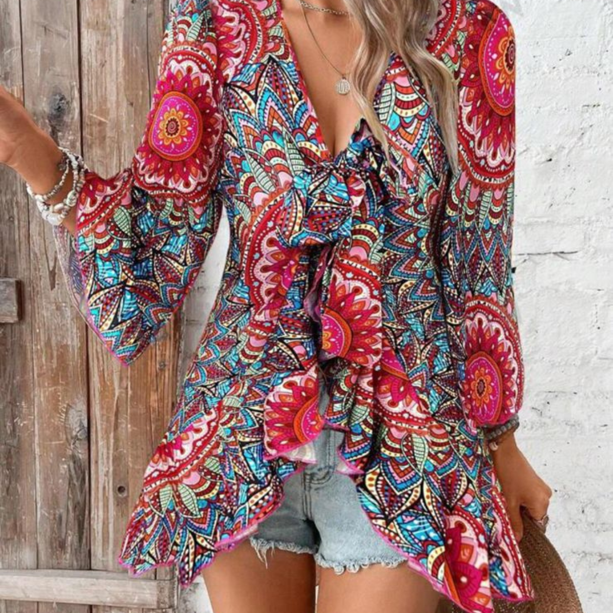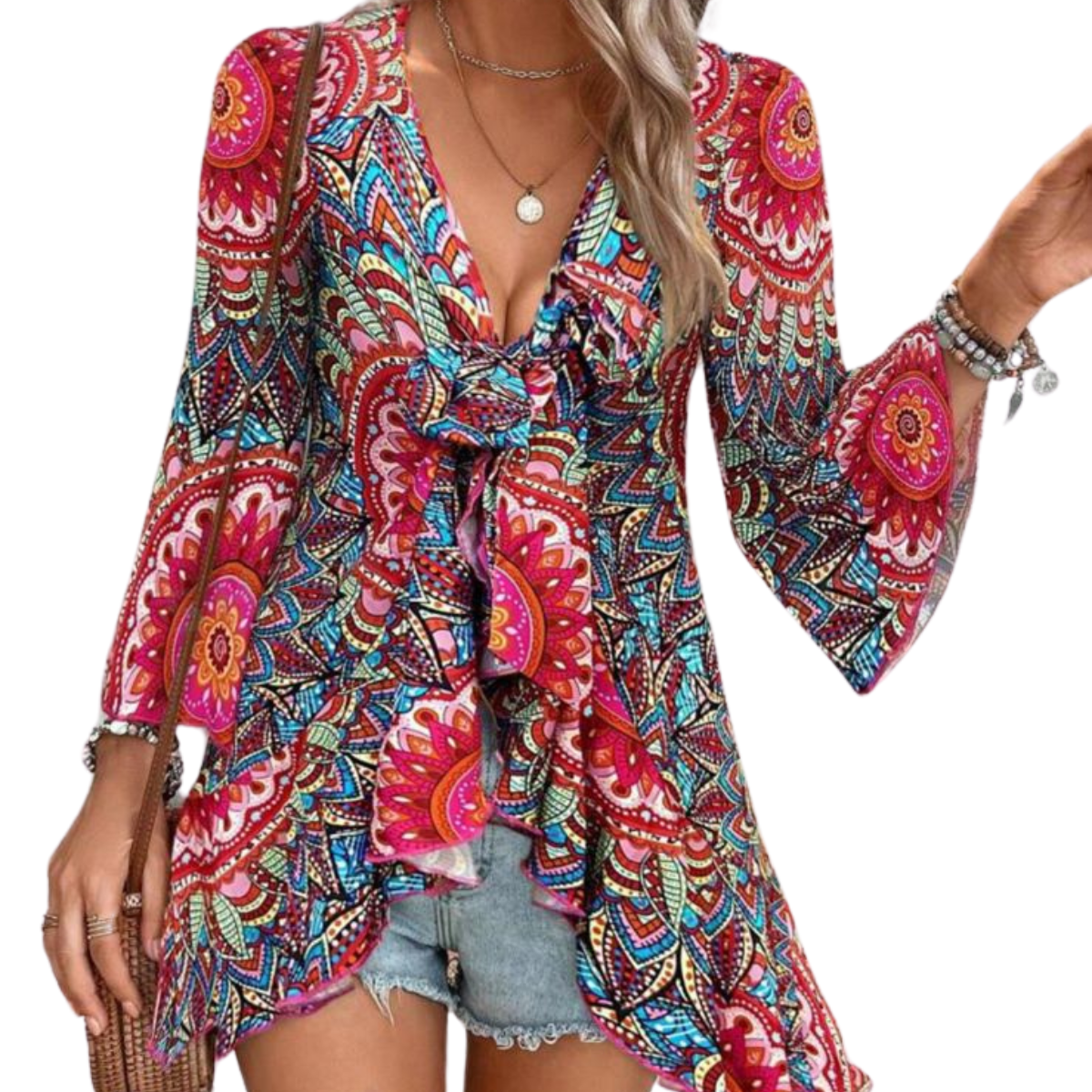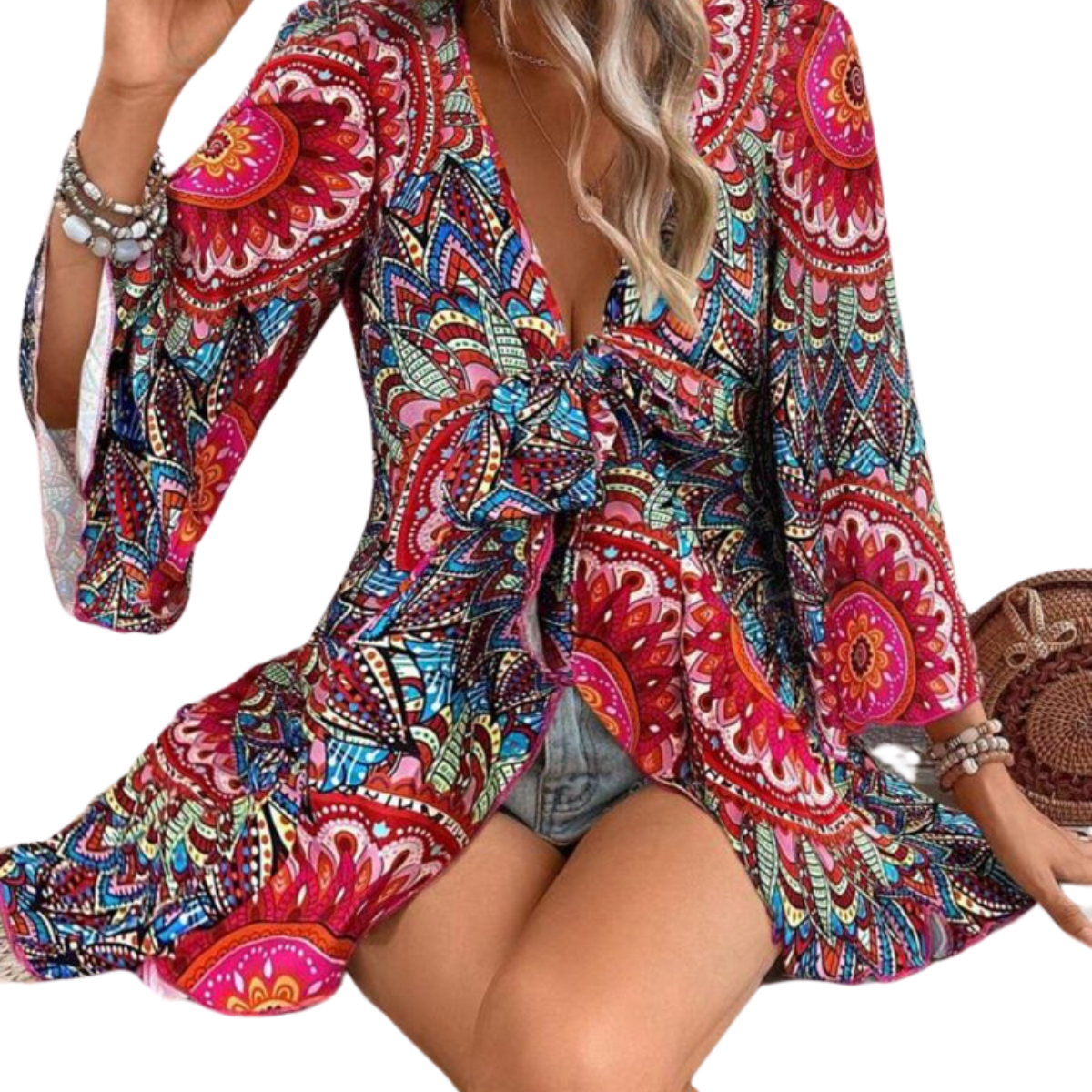 This eye-catching blouse features a vibrant multicolor mandala pattern that exudes a bohemian vibe. The flare sleeves add a flowy, graceful element to the design, enhancing the overall aesthetic with a touch of whimsy. Perfect for those who appreciate artistic and bold prints, this blouse pairs well with simple bottoms to let its elaborate pattern stand out. It's ideal for casual outings or artistic events, offering both comfort and style in a strikingly colorful package.