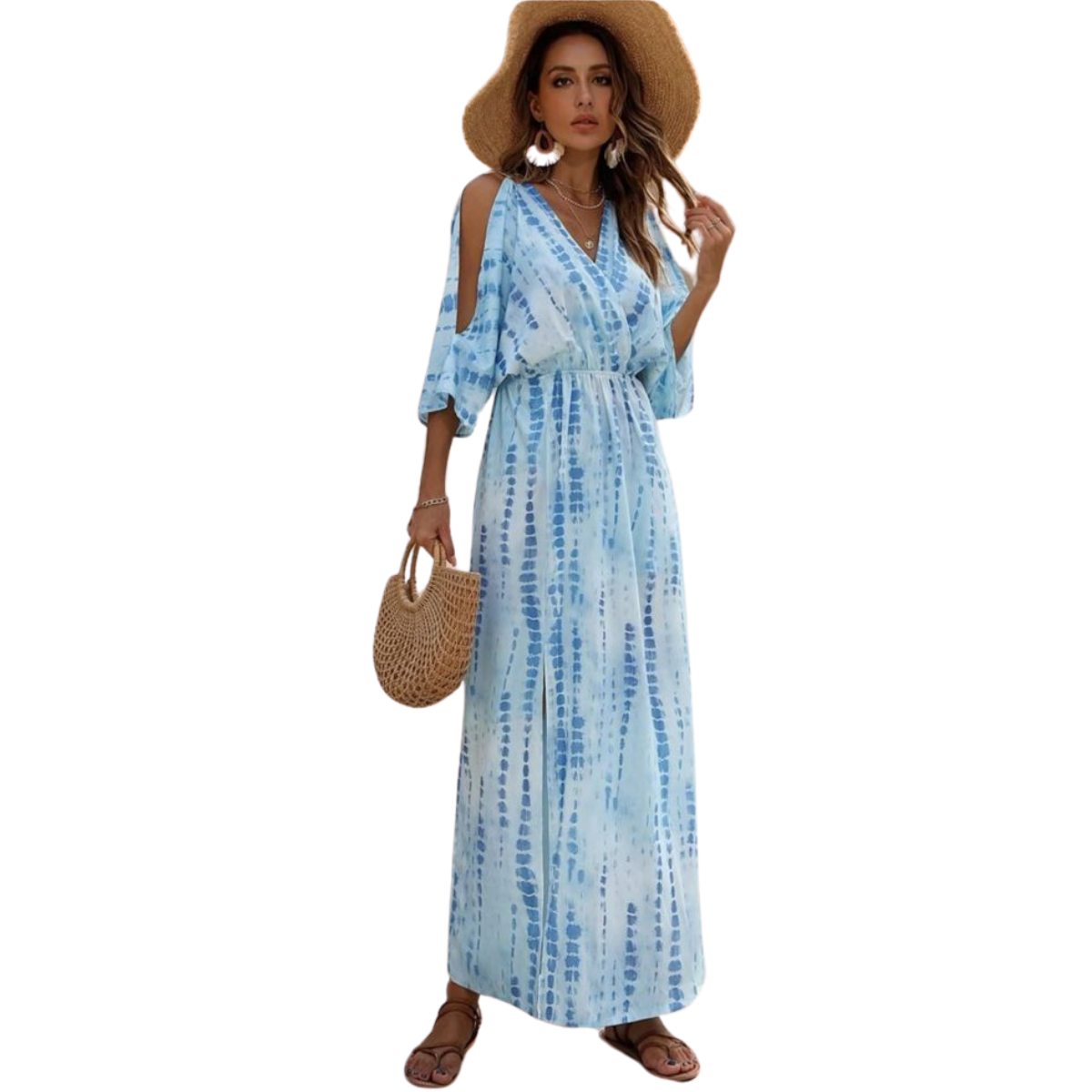 This stylish dress boasts a unique split sleeve design, offering a modern take on classic elegance. The dress is divided into blue and white sections, creating a striking visual contrast. The split sleeves add a dynamic and fashionable element, perfect for both casual and dressier occasions. This piece is versatile and ideal for those who want to make a bold fashion statement while maintaining a sense of timeless style.