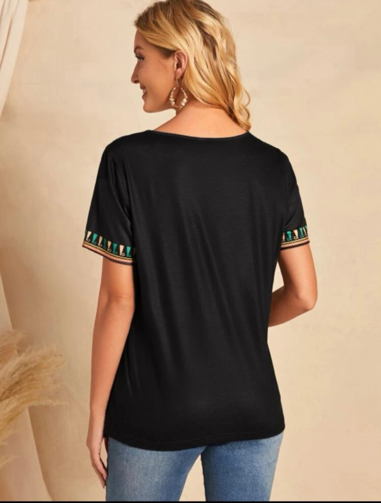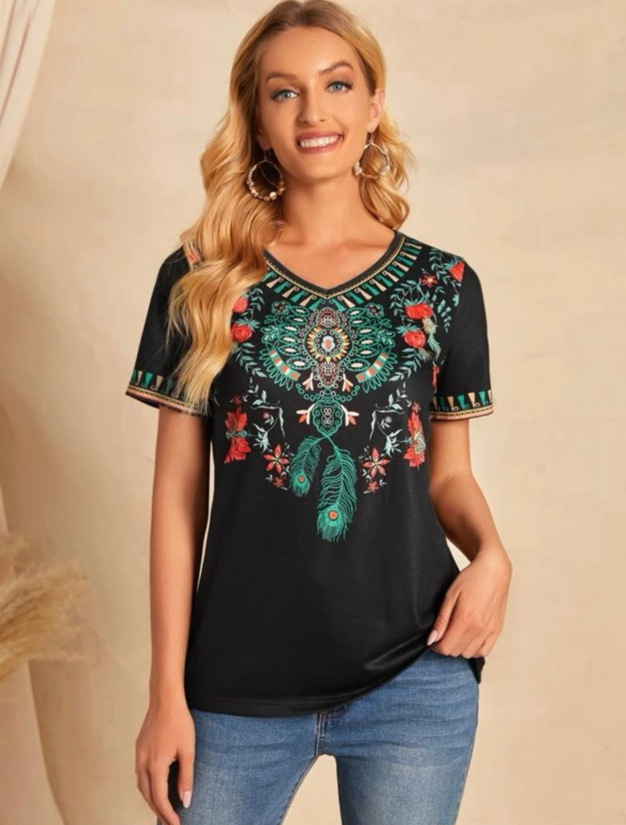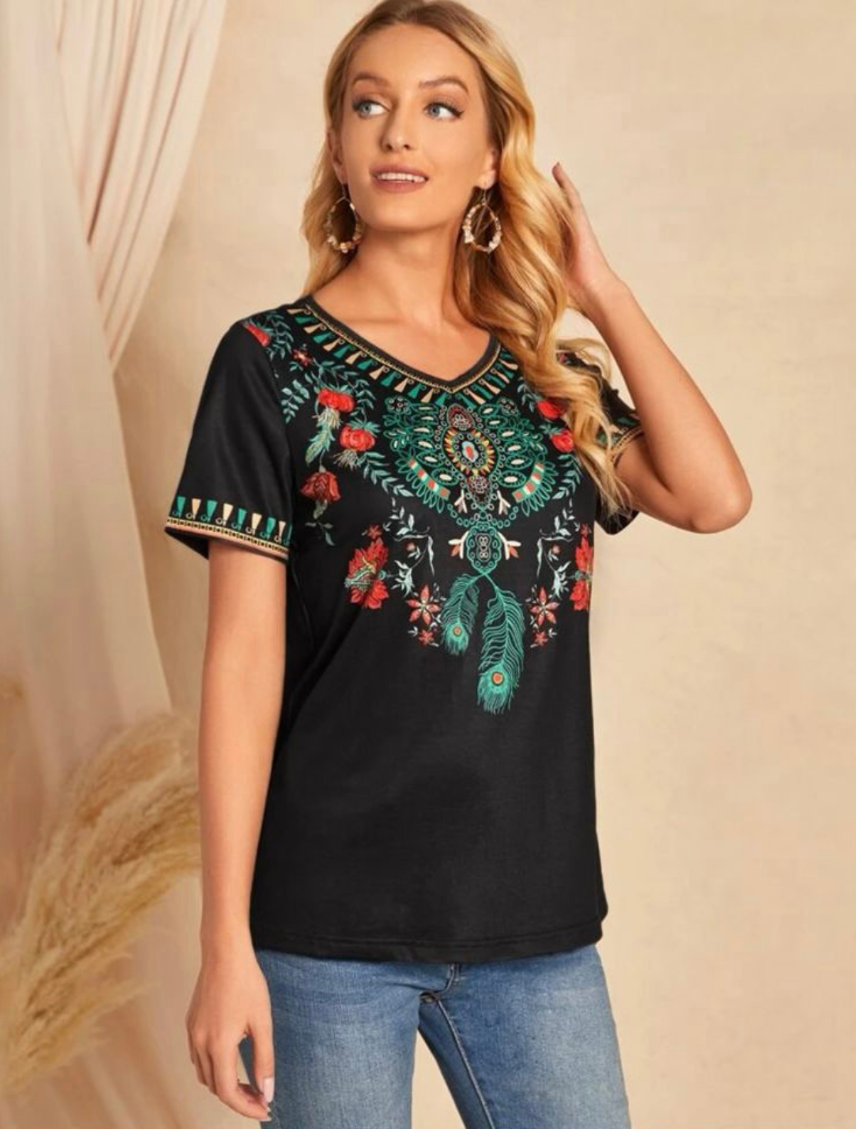 Black Floral Print V Neck Top
