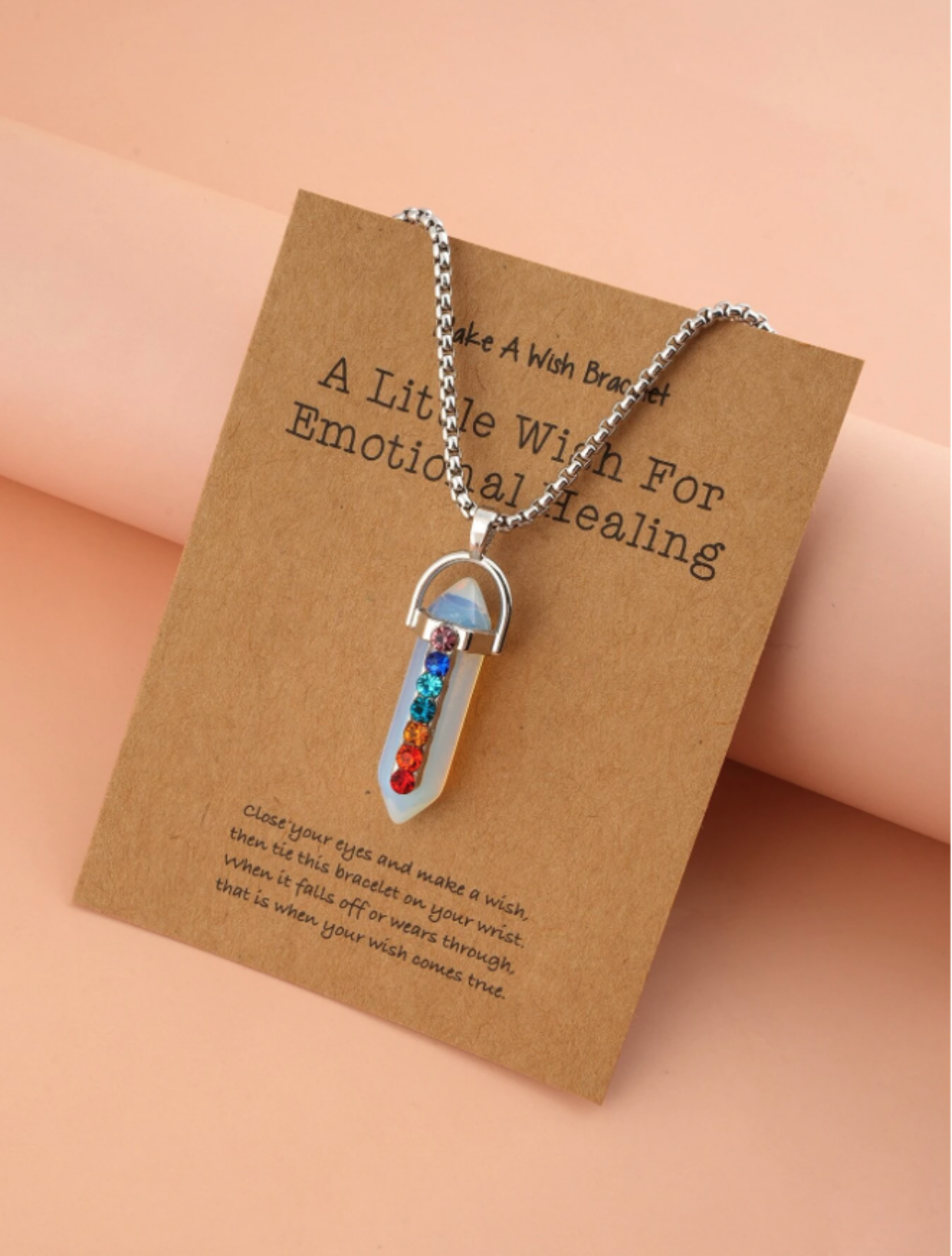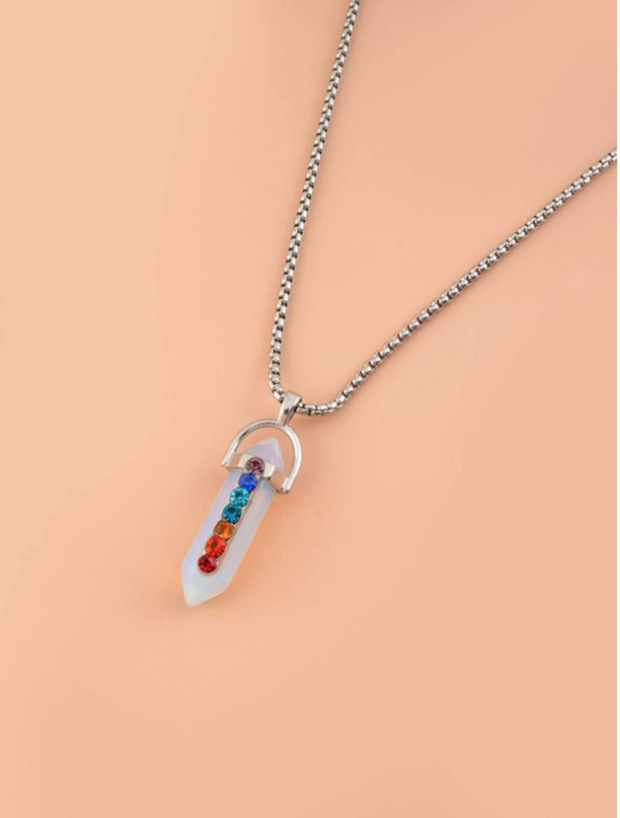 Experience a harmonious blend of spirituality and modern design with our White and Chakra Colour Geometric Necklace. Expertly crafted from high-quality materials, this stunning necklace features a sleek white chain adorned with geometric pendants that represent the seven chakra colors: red, orange, yellow, green, blue, indigo, and violet. Each color serves to symbolize a different energy center in the body, adding a layer of depth and meaning to this eye-catching piece. The juxtaposition of the crisp white chain with the vibrant chakra colors creates a balanced aesthetic that's both striking and soothing. Perfect for anyone looking to align fashion with spiritual well-being, this necklace is not just a statement piece but also a wearable form of mindfulness. Our White and Chakra Colour Geometric Necklace offers a unique blend of style and serenity, making it a versatile accessory for a variety of occasions.