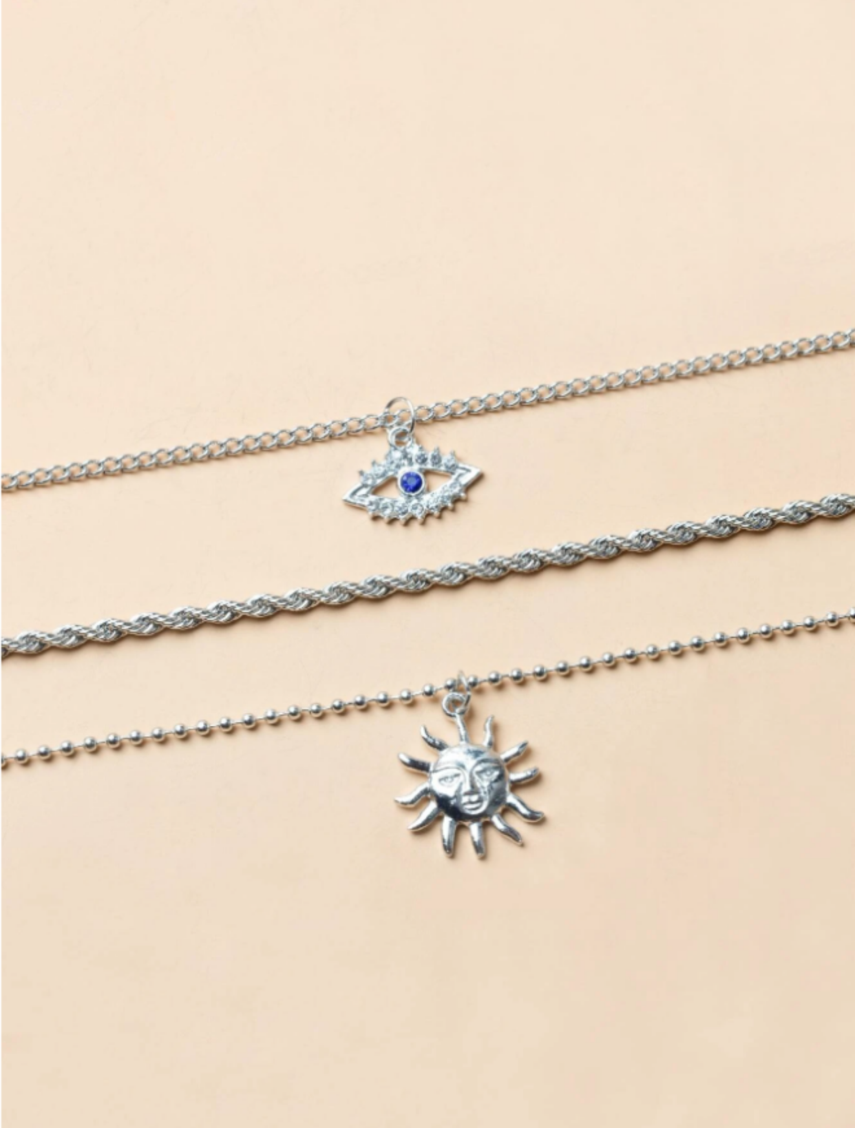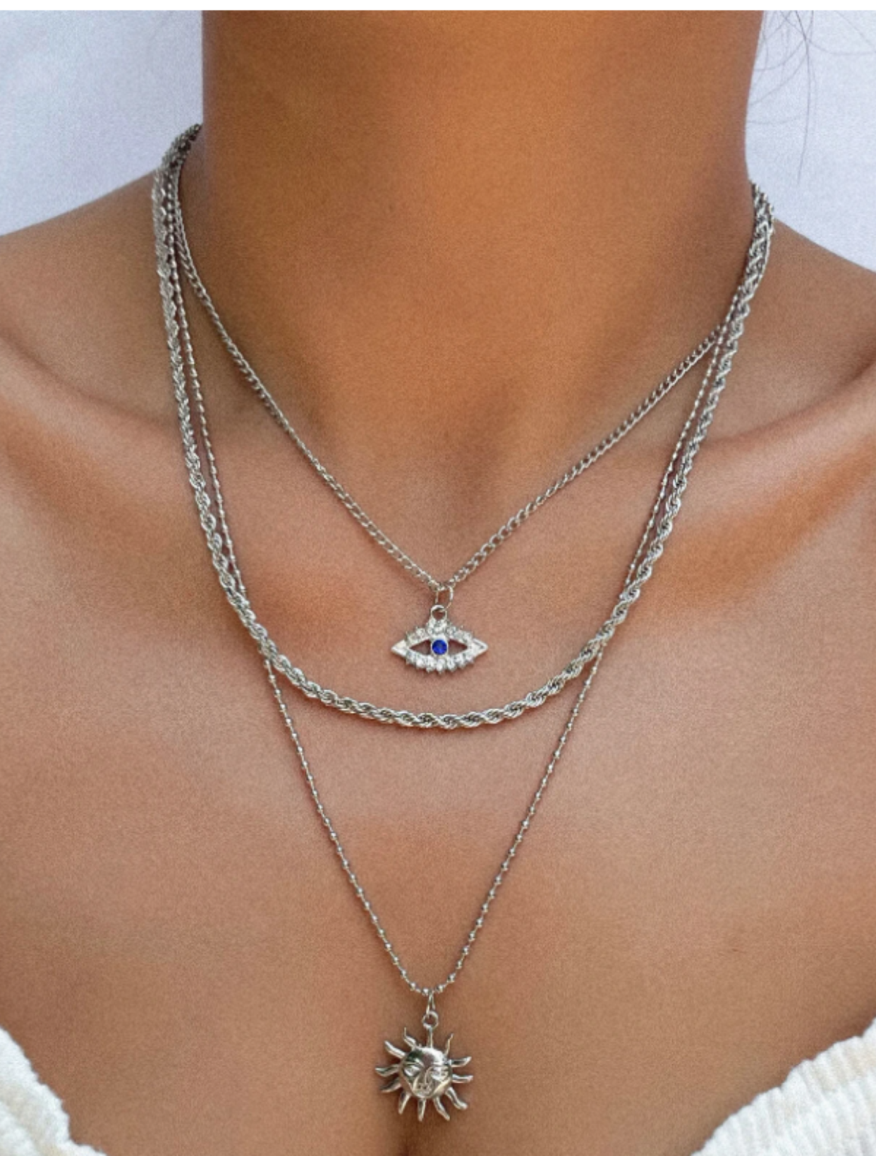 Experience a harmonious blend of mystique and glamour with our Rhinestone Eye Charm Layered Necklace. Exquisitely crafted, this necklace features a central eye charm encrusted with shimmering rhinestones, serving as a captivating focal point. The eye, a universal symbol of protection and insight, is nestled between layered chains that gracefully cascade, offering depth and dimension to the design. The sparkle of the rhinestones contrasts beautifully with the sleek metal, creating a piece that's both modern and timeless. This necklace is not only a statement of style but also a nod to the age-old belief in the protective and perceptive powers of the eye. Perfect for those looking to make a stylish yet meaningful statement, our Rhinestone Eye Charm Layered Necklace adds a touch of intrigue to any ensemble.