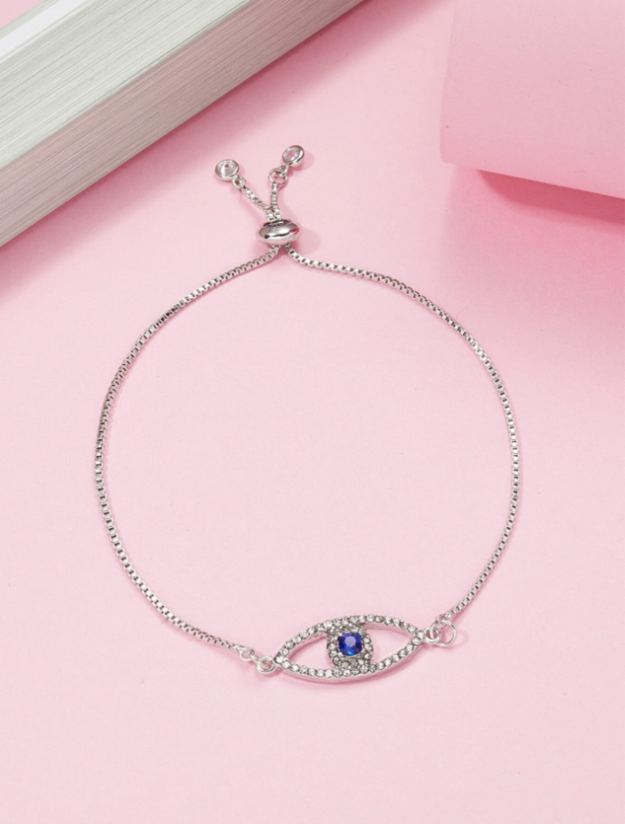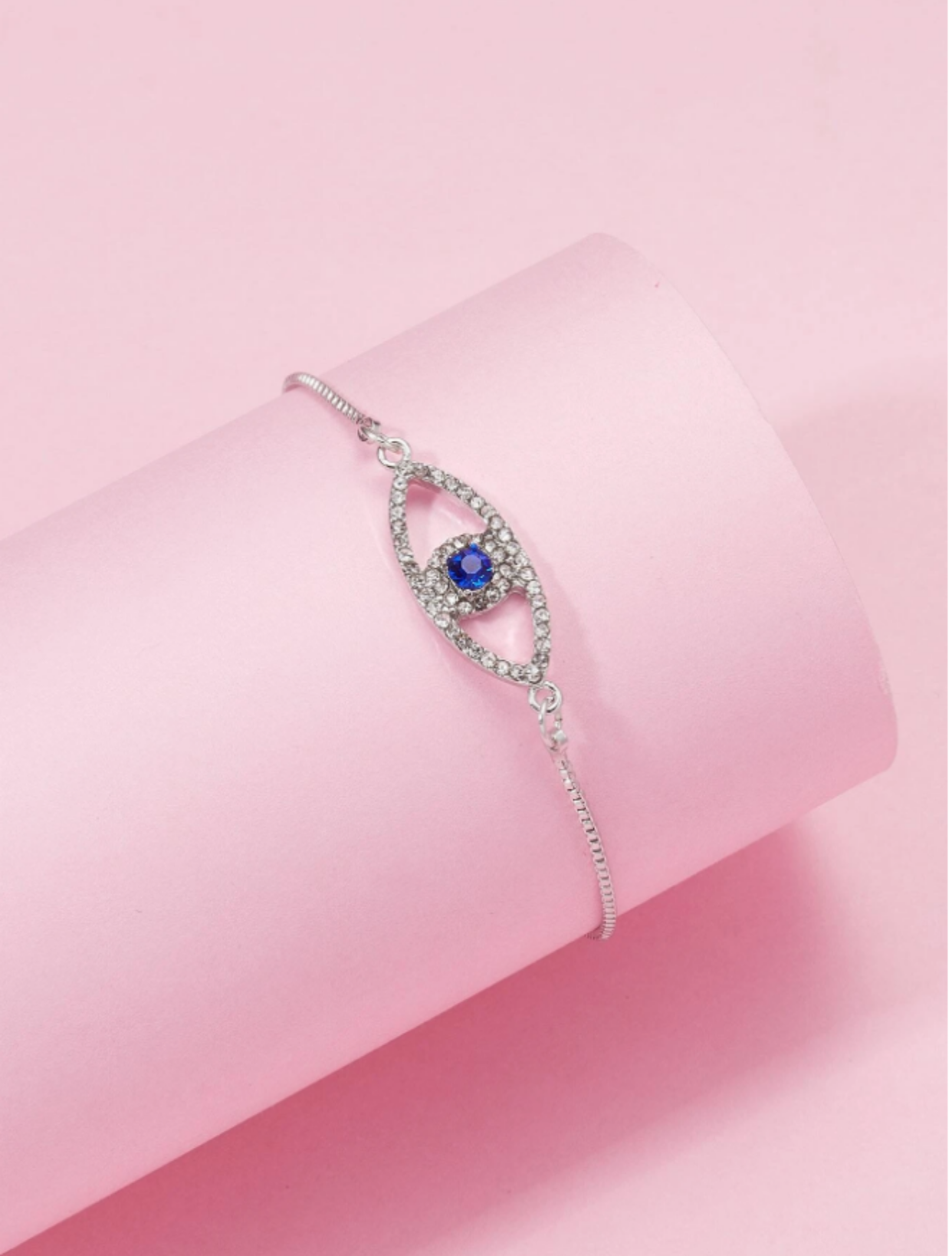 Dive into a realm of elegance and mystique with our Royal Blue Rhinestone Eye Decor Bracelet. Delicately handcrafted, this bracelet is centered around a captivating eye emblem, embellished with royal blue rhinestones that glisten like the midnight sky. This eye, a timeless symbol of protection, insight, and allure, is set against a sleek metal band that wraps comfortably around the wrist. The deep blue of the rhinestones, paired with the bracelet's lustrous finish, strikes a balance between opulence and subtlety, making it a versatile accessory for various occasions. Whether worn as a singular statement piece or layered with other favorites, our Royal Blue Rhinestone Eye Decor Bracelet is an exquisite fusion of tradition, symbolism, and modern elegance.