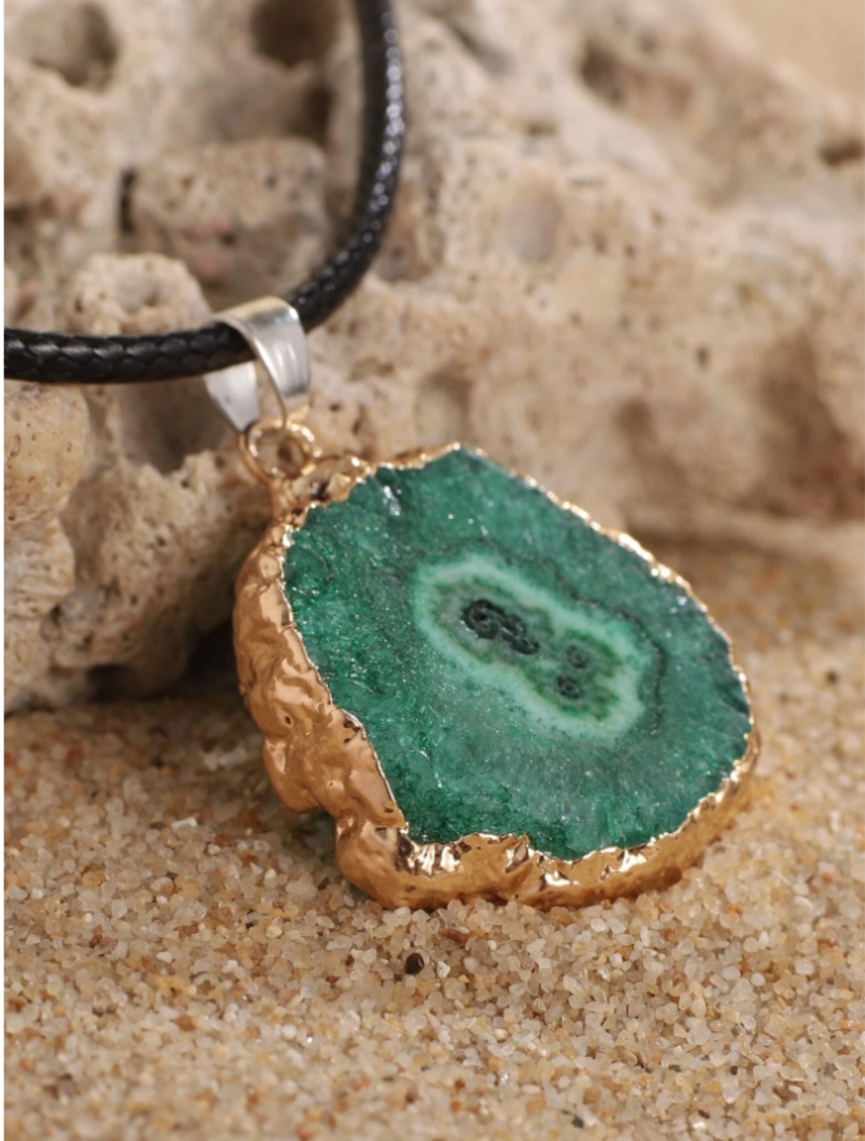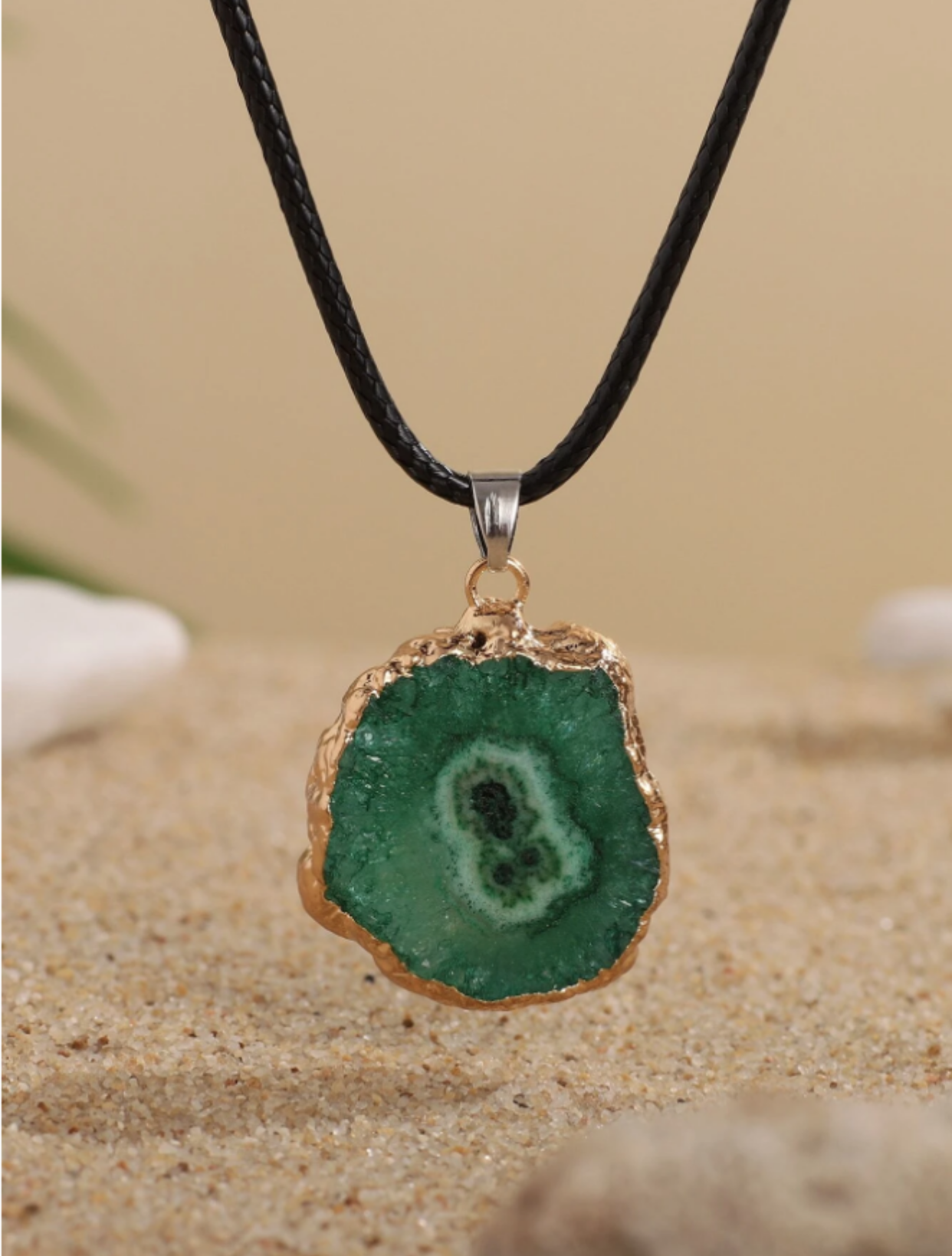 Infuse nature's tranquility with our Green Stone Charm Necklace. Crafted with care, this necklace features a radiant green stone pendant, a symbol of growth, renewal, and harmony. Suspended from a delicate chain, the verdant charm captures the essence of a serene forest glade, making it a perfect accessory for those who cherish nature's beauty. This necklace effortlessly blends elegance with earthy charm, offering a touch of serenity in every wear.