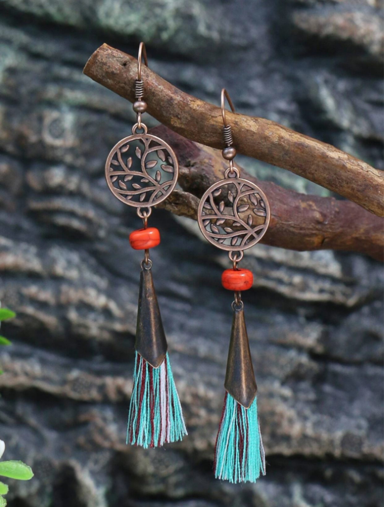 Red, Bronze & Turquoise Tassel Decor Drop Earrings